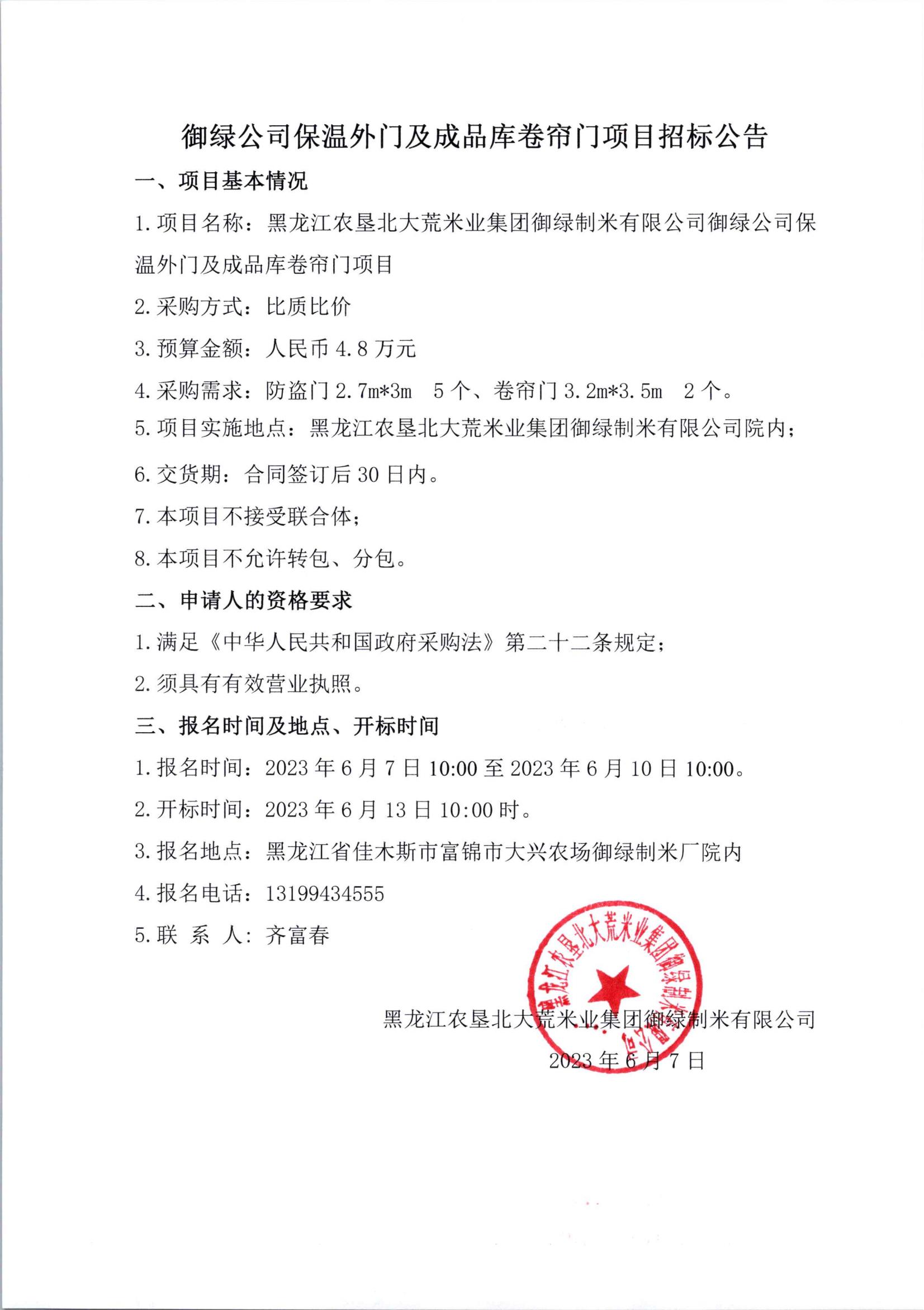 御綠公司保溫外門(mén)及成品庫(kù)卷簾門(mén)項(xiàng)目招標(biāo)公告