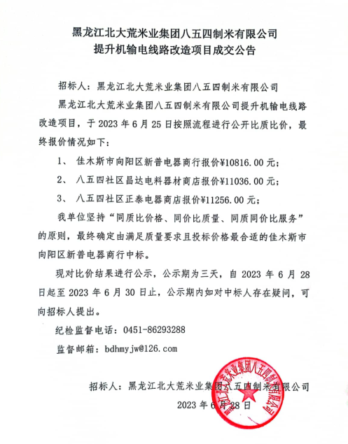 黑龍江省北大荒米業(yè)集團有限公司八五四制米有限公司提升機輸電線路改造項目成交公告