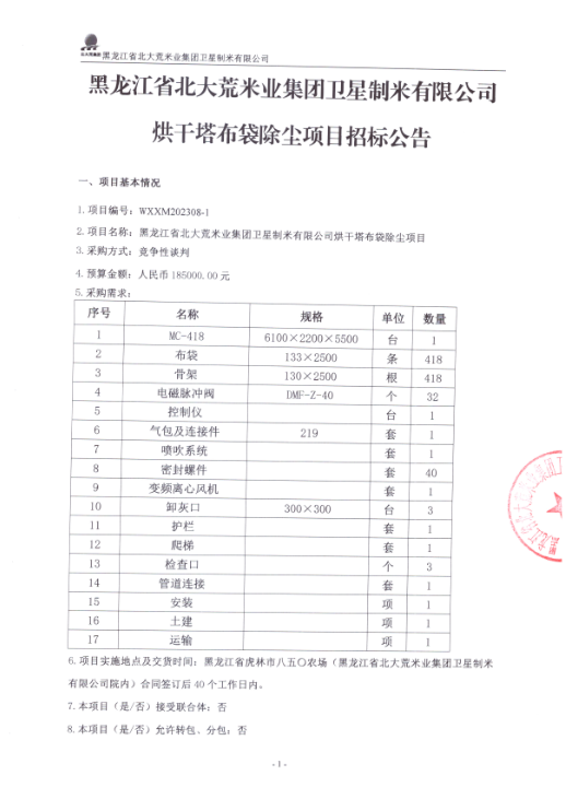 黑龍江省北大荒米業(yè)集團衛(wèi)星制米有限公司烘干塔布袋除塵項目招標(biāo)公告