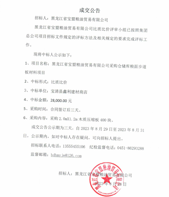 黑龍江省寶盟糧油貿(mào)易有限公司采購倉儲庫內(nèi)糧面步道板材項目中標公告