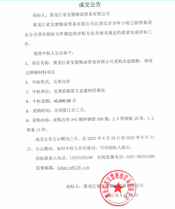 黑龍江省寶盟糧油貿易有限公司采購改造爬梯、增設過橋梯材料項目中標公告