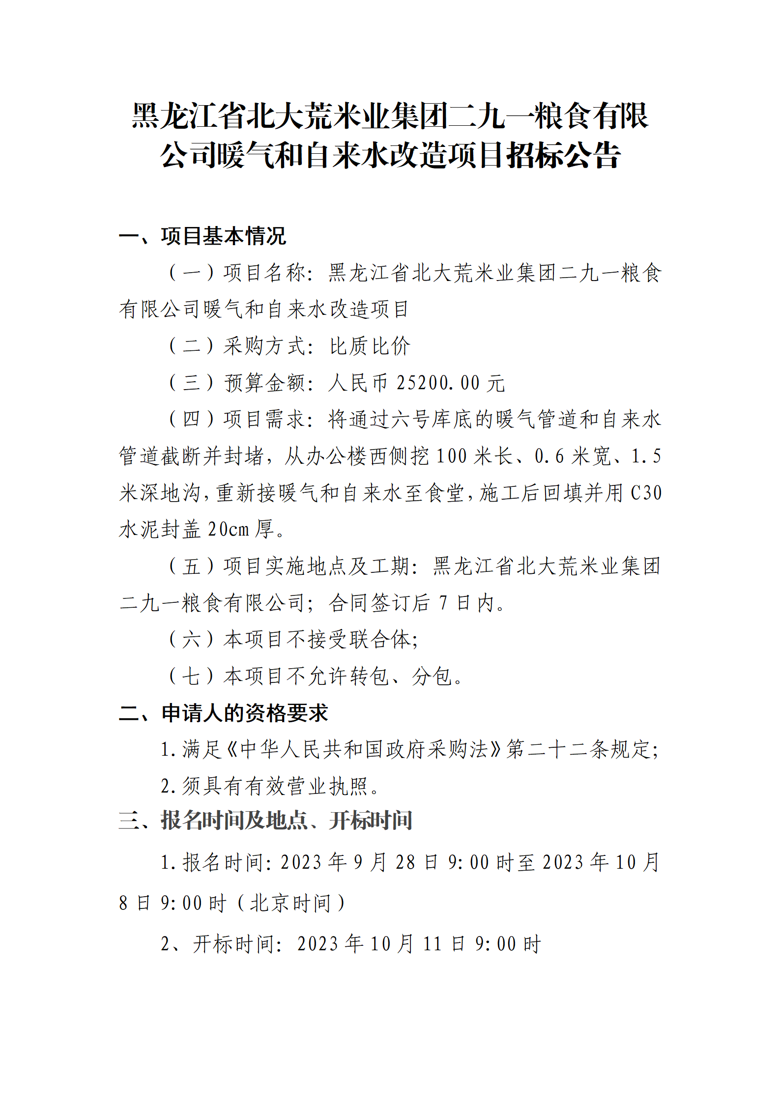黑龍江省北大荒米業(yè)集團(tuán)二九一糧食有限公司暖氣和自來水改造項(xiàng)目招標(biāo)公告