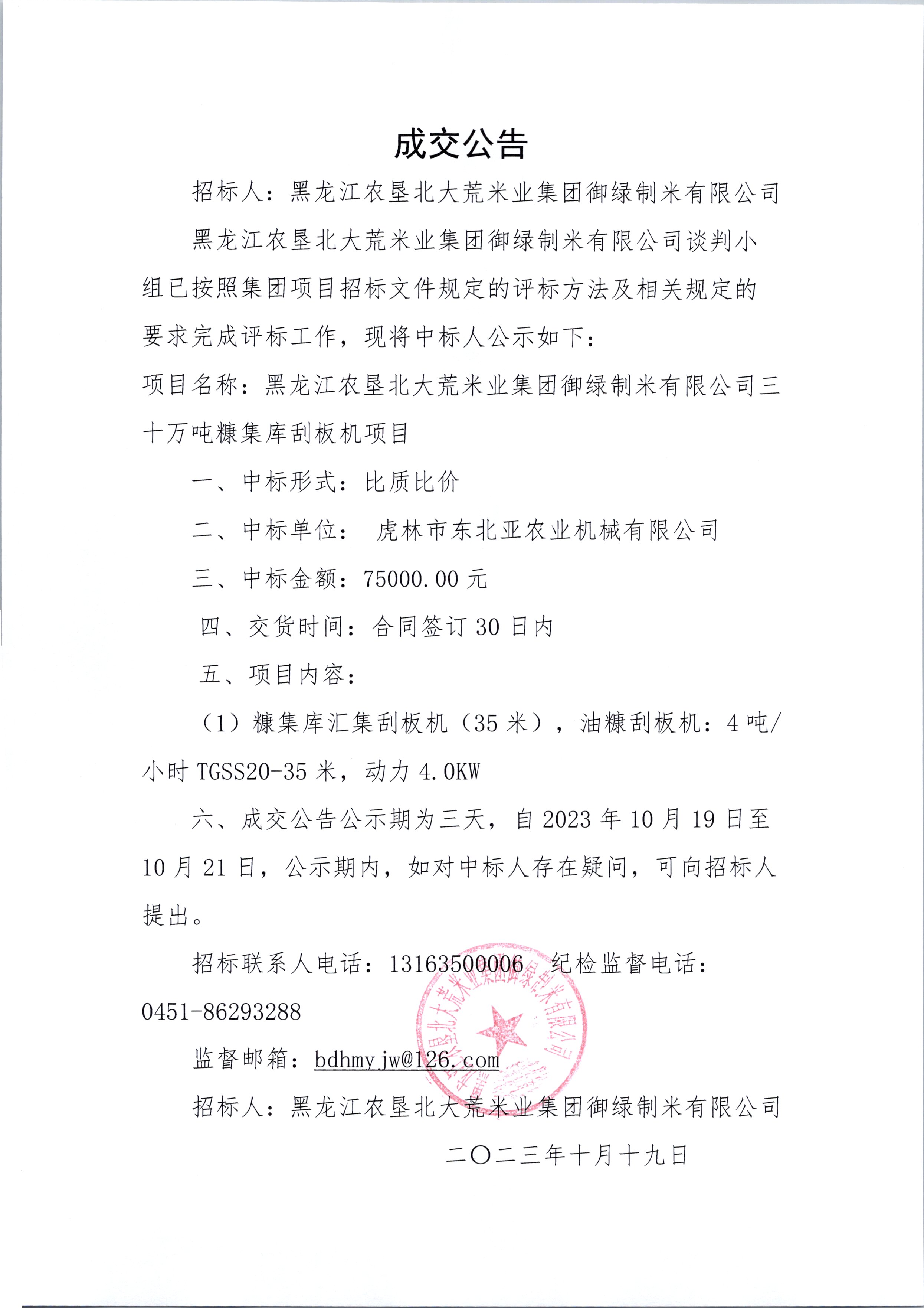 黑龍江農(nóng)墾北大荒集團(tuán)御綠制米有限公司三十萬噸糠集庫刮板機(jī)項(xiàng)目成交公告
