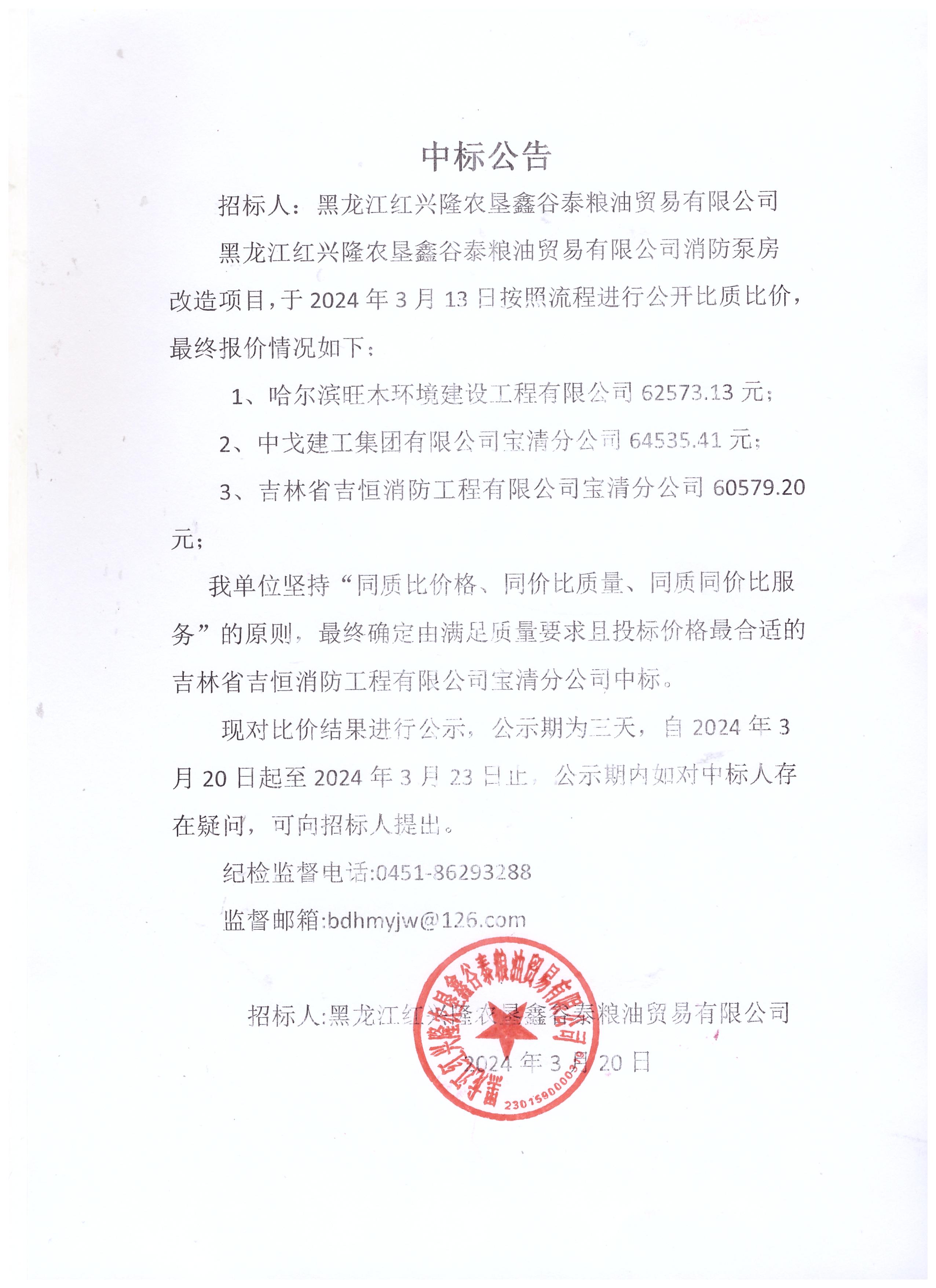 黑龍江紅興隆農(nóng)墾鑫谷泰糧油貿(mào)易有限公司消防泵房改造項目中標公告