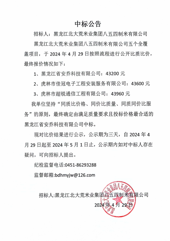 北大荒米業(yè)854制米公司五個(gè)覆蓋安裝采購項(xiàng)目中標(biāo)公告