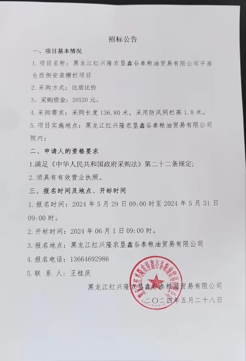 黑龍江紅興隆農(nóng)墾鑫谷泰糧油貿(mào)易有限公司平房倉(cāng)西側(cè)安裝欄柵項(xiàng)目招標(biāo)公告