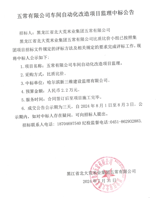 五常有限公司車(chē)間自動(dòng)化改造項(xiàng)目監(jiān)理中標(biāo)公告