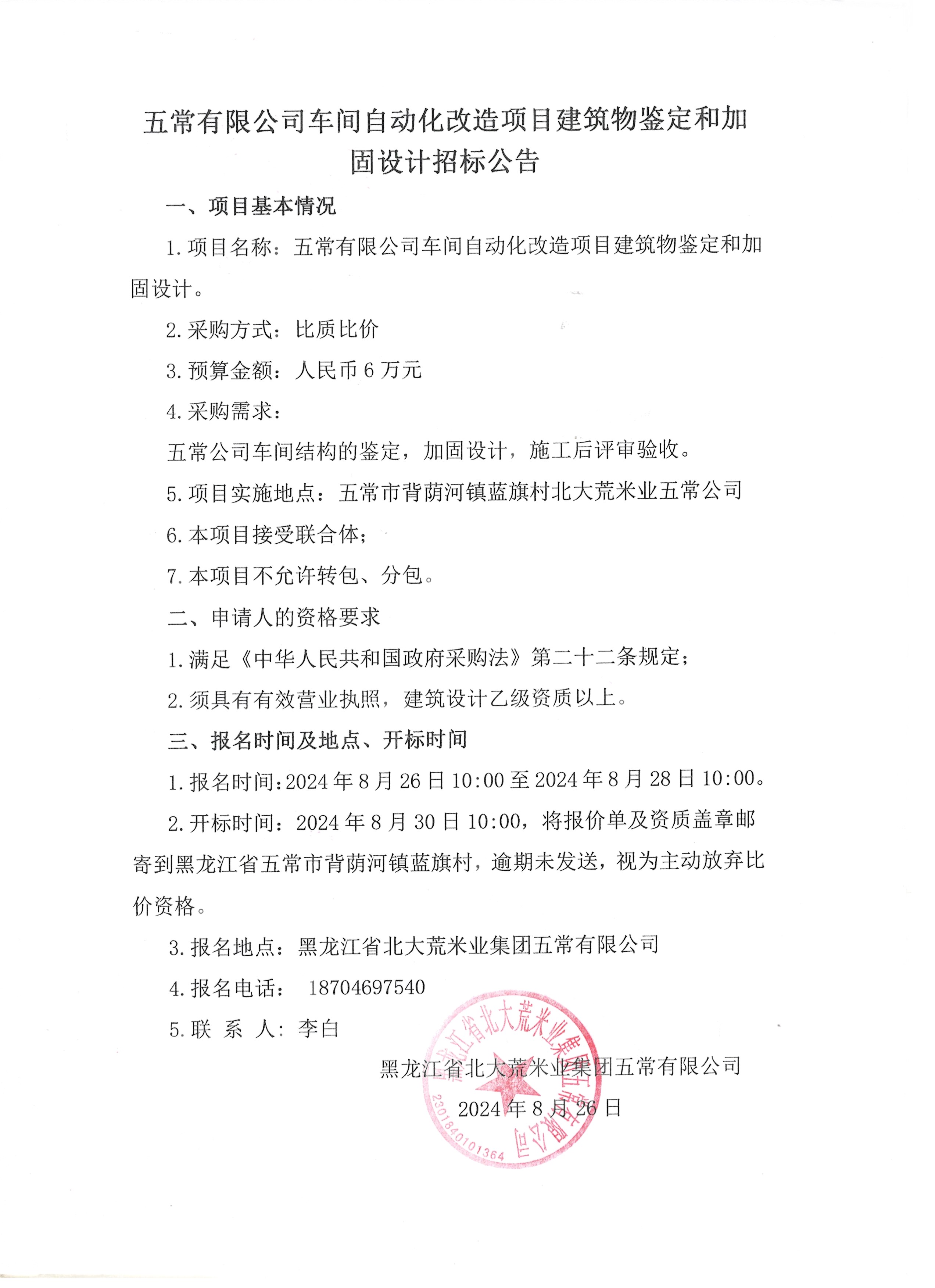 五常有限公司車間自動化改造項目建筑物鑒定和加固設(shè)計招標公告