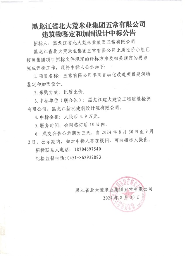 北大荒米業(yè)五常公司建筑物鑒定和加固設(shè)計(jì)中標(biāo)公告