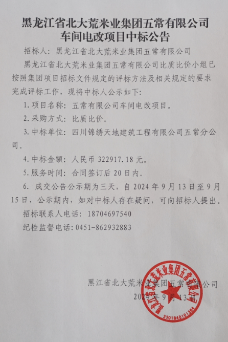 黑龍江省北大荒米業(yè)集團(tuán)五常有限公司車間電改項(xiàng)目中標(biāo)公告
