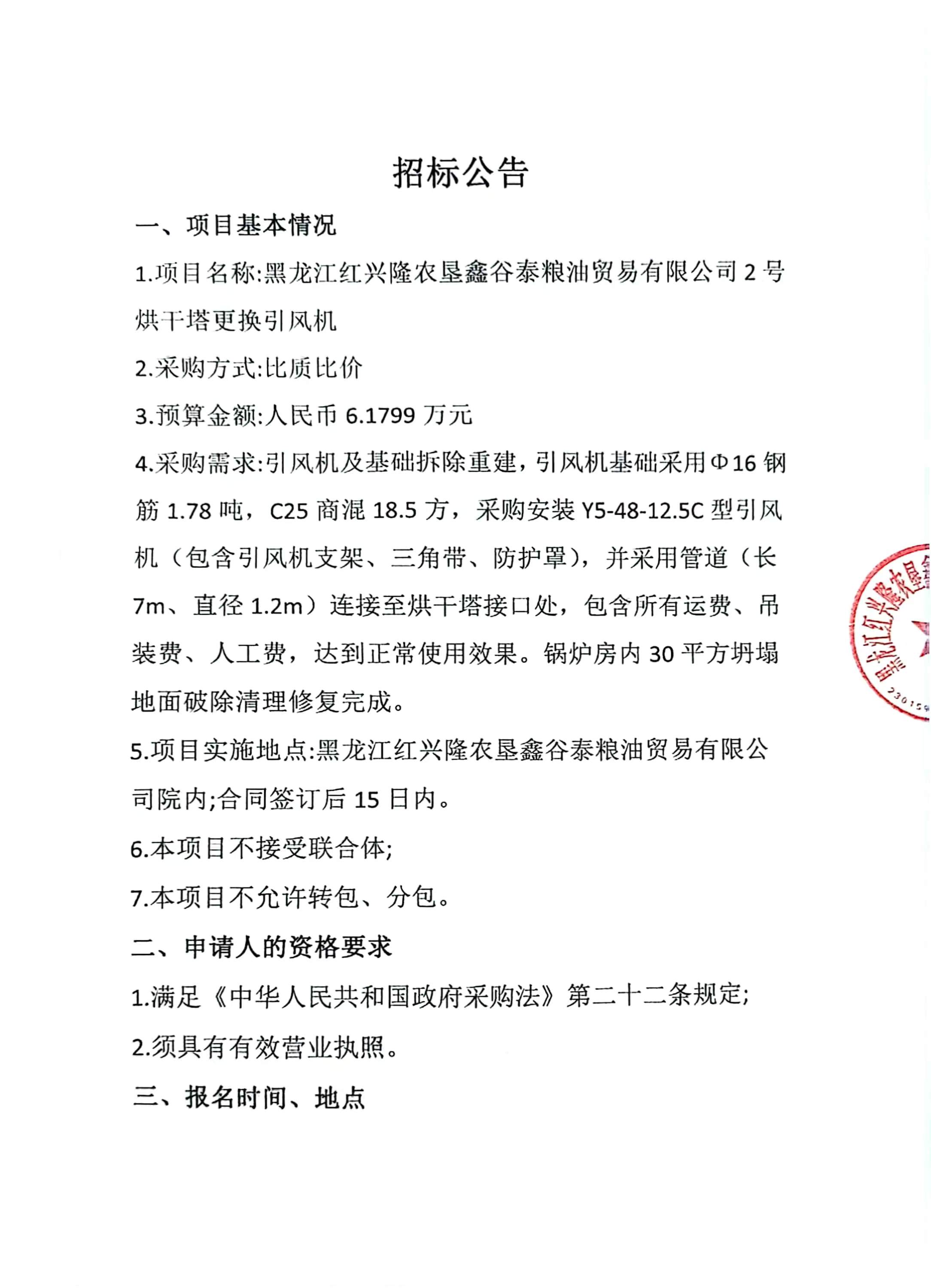 黑龍江紅興隆農(nóng)墾鑫谷泰糧油貿(mào)易有限公司2號(hào)烘干塔更換引風(fēng)機(jī)招標(biāo)公告
