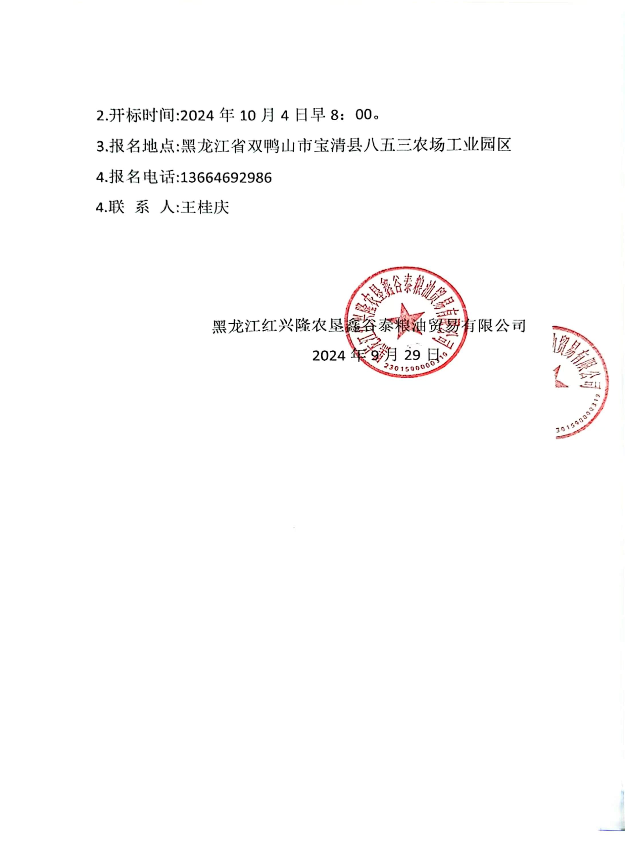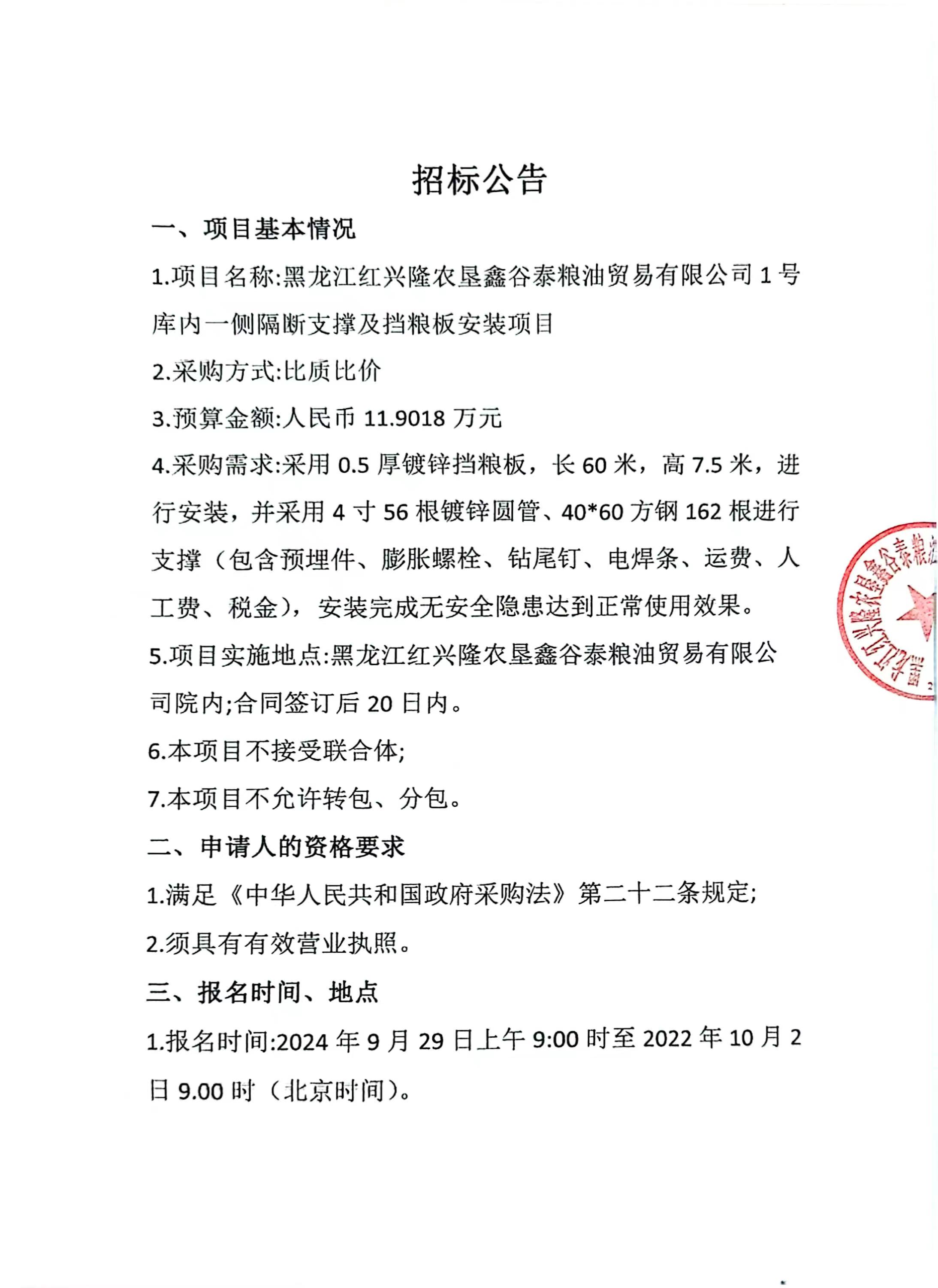 黑龍江紅興隆農(nóng)墾鑫谷泰糧油貿(mào)易有限公司1號(hào)庫內(nèi)一側(cè)隔斷支撐及擋糧板支撐及擋糧板安裝項(xiàng)目招標(biāo)公告