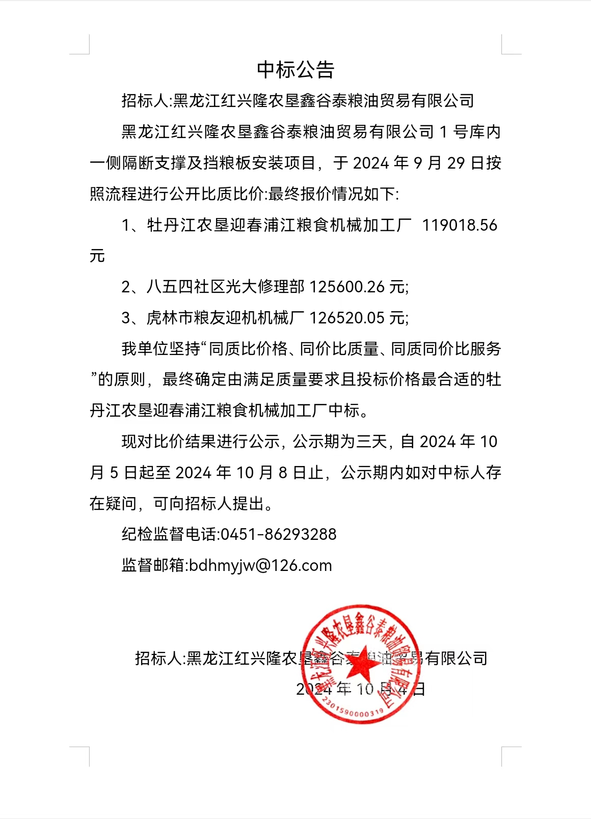 鑫谷泰糧油公司1號庫隔斷支撐及擋糧板項目中標(biāo)公告