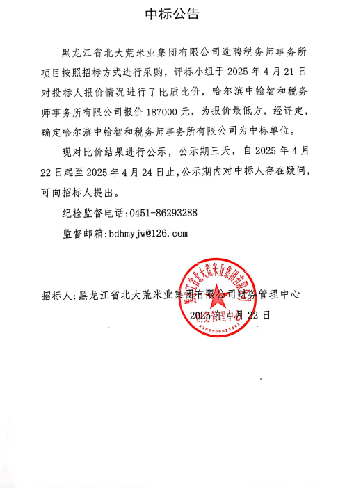 黑龍江省北大荒米業(yè)集團(tuán)有限公司選聘稅務(wù)師事務(wù)所項(xiàng)目中標(biāo)公告