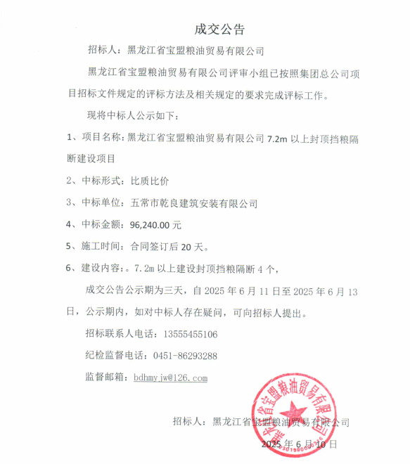 黑龍江省寶盟糧油貿(mào)易有限公司7.2m以上封頂擋糧隔斷建設項目成交公告