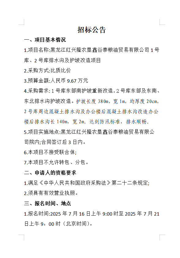 黑龍江紅興隆農(nóng)墾鑫谷泰公司國(guó)儲(chǔ)糧1號(hào)、2號(hào)排水溝及護(hù)坡改造項(xiàng)目招標(biāo)公告