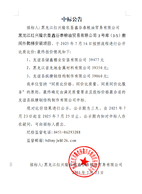 黑龍江紅興隆農墾鑫谷泰糧油貿易有限公司3號庫(3-5)廒間外爬梯安裝項目中標公告