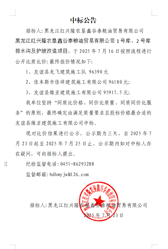 黑龍江紅興隆農(nóng)墾鑫谷泰糧油貿(mào)易有限公司1號(hào)庫、2號(hào)庫排水溝及護(hù)坡改造項(xiàng)目中標(biāo)公告
