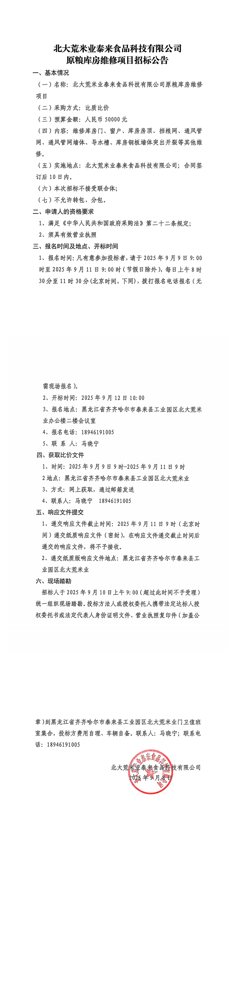 北大荒米業(yè)泰來食品科技有限公司原糧庫房維修項目