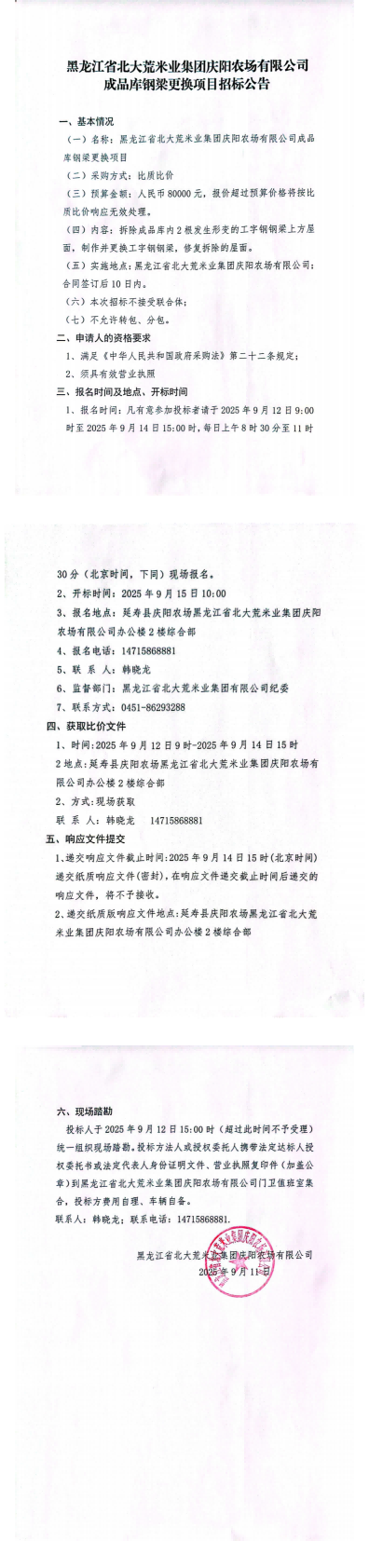 黑龍江省北大荒米業(yè)集團慶陽農(nóng)場有限公司成品庫鋼梁更換項目招標(biāo)公告