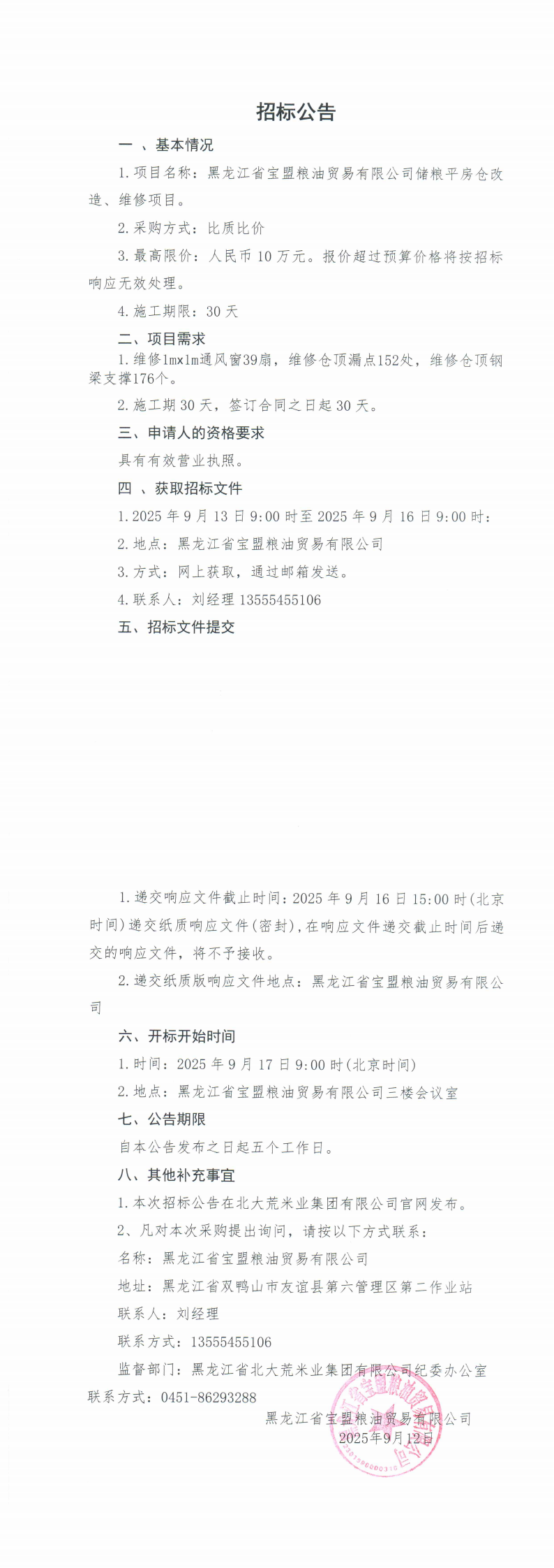 寶盟糧油貿(mào)易有限公司儲(chǔ)糧平房倉(cāng)改造、維修項(xiàng)目招標(biāo)公告