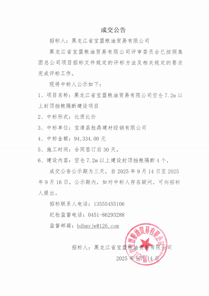 寶盟糧油貿(mào)易有限公司空倉7.2m以上封頂擋糧隔斷建設(shè)項(xiàng)目中標(biāo)公告