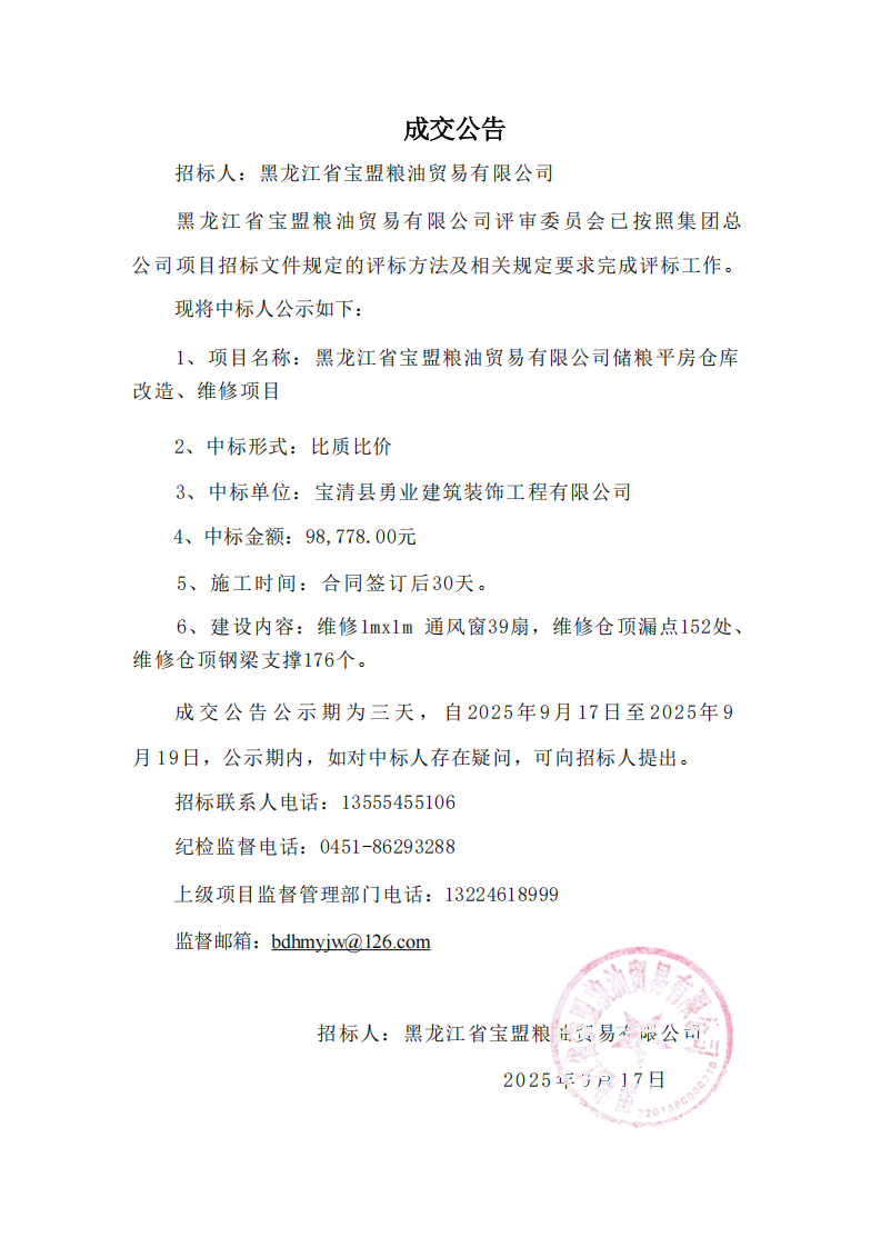 黑龍江省寶盟糧油貿(mào)易有限公司儲糧平房倉庫改造、維修項目中標(biāo)公告