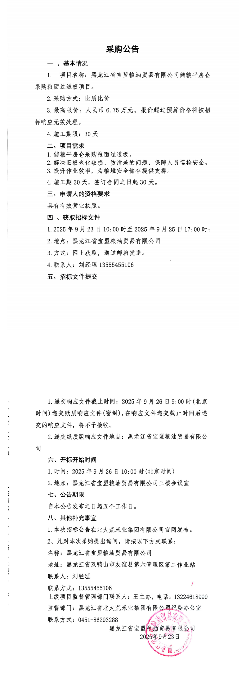 黑龍江省寶盟糧油貿(mào)易有限公司儲(chǔ)糧平房倉采購糧面過道板項(xiàng)目招標(biāo)公告