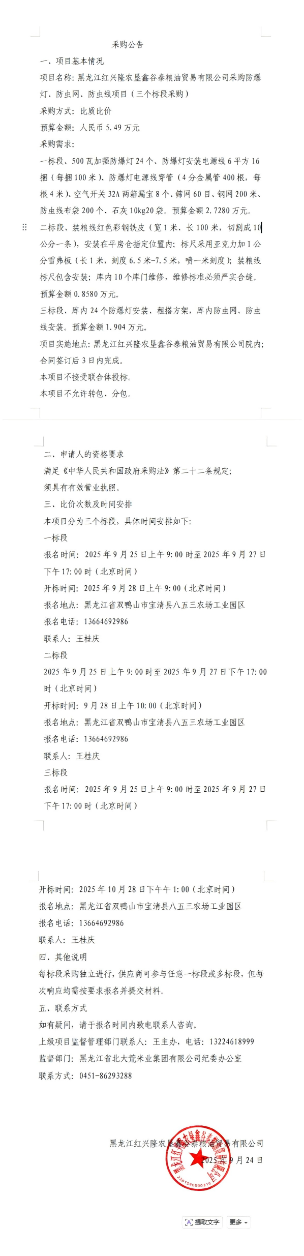 鑫谷泰糧油貿(mào)易有限公司采購(gòu)防爆燈、防蟲網(wǎng)、防蟲線項(xiàng)目采購(gòu)公告