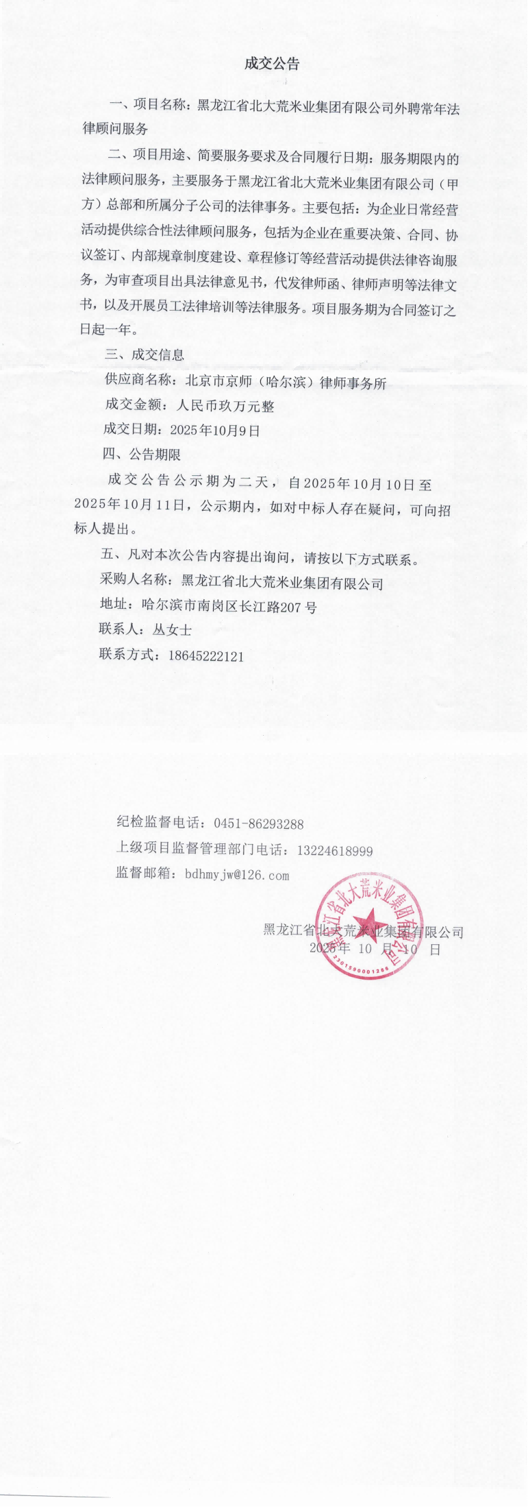 黑龍江省北大荒米業(yè)集團有限公司外聘常年法律顧問服務成交公告
