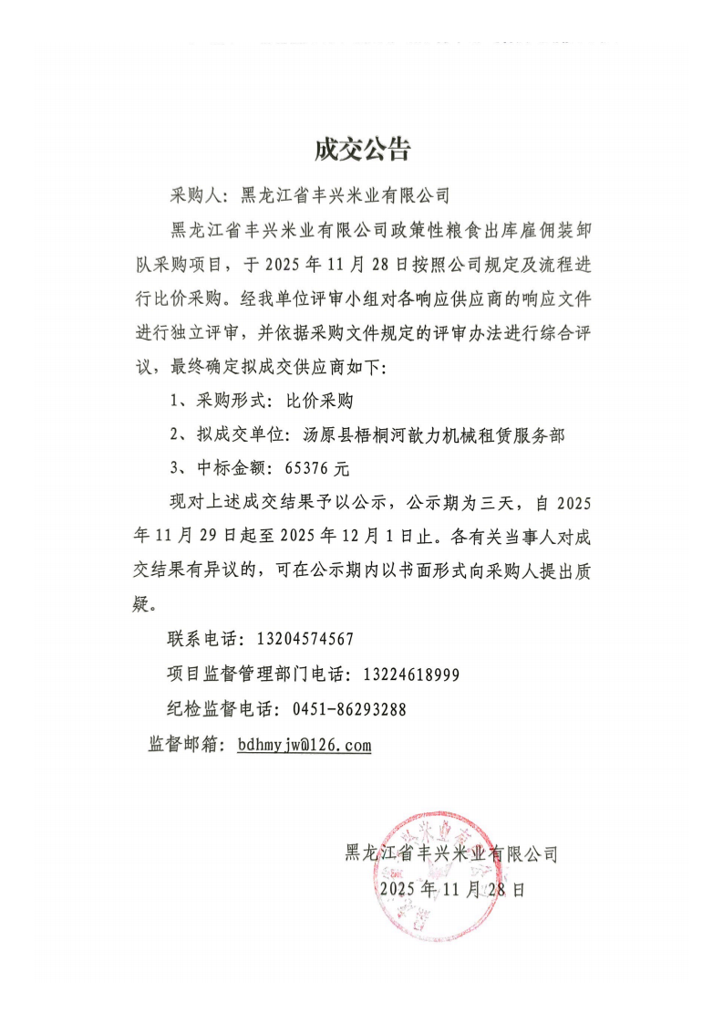 豐興米業(yè)政策性糧食出庫雇傭裝卸隊(duì)成交公告